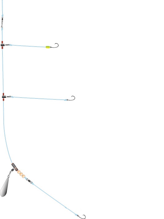 Τους αμμώδεις βυθούς τους άφησα στην τελευταία θέση αυτής της κατάταξης, αφού αποτελούν μια σχετικά εύκολη λύση για όσους ασχολούνται λίγο καιρό με ψάρεμα, ή για κάποιους που δεν διαθέτουν τον κατάλληλο εξοπλισμό για να έρθουν αντιμέτωποι με τις παραπάνω καταστάσεις. Πολλοί ψαράδες πιστεύουν ότι σε ένα βυθό που αποτελείται από άμμο τα ψάρια, τα οποία μπορεί κάποιος να πιάσει, είναι ελάχιστα και μικρά. Στην πραγματικότητα όμως τα πράγματα δεν είναι έτσι, καθώς δεν είναι λίγες οι φορές που έχουν πιαστεί μεγάλα ψάρια. Για να ψαρέψουμε σε μία αμμώδη παραλία δεν απαιτείται κάτι το εξειδικευμένο όσον αφορά τα καλάμια και τους μηχανισμούς. Μπορούμε να ψαρέψουμε με πολύ ελαφριά καλάμια τύπου light με casting weight από 50 έως και 100 γρ., αλλά και με πολύ πιο σκληρά όπως των 200 γρ. c.w. Το ίδιο ακριβώς ισχύει και για τους μηχανισμούς, οι οποίοι μπορούν να είναι τύπου casting με μικρές μπομπίνες αλλά και surf casting. Ο ελαφρύς εξοπλισμός θα μας βοηθήσει να πραγματοποιήσουμε ένα ξεκούραστο ψάρεμα σε σχετικά κοντινές αποστάσεις, ενώ τα σκληρά καλάμια εφοδιασμένα με λεπτές πετονιές στους μηχανισμούς θα μας δώσουν την ευκαιρία να αναζητήσουμε τα ψάρια και στις πιο βαθιές ζώνες. Επίσης, λόγω του καθαρού βυθού χωρίς φυσικά εμπόδια μας δίνεται η ευκαιρία να μειώσουμε σημαντικά τις διαμέτρους των παράμαλλων, κάτι που θα μας ωφελήσει κάνοντας τις αρματωσιές μας πιο διακριτικές στα μάτια των ψαριών. Αυτό θα μας αποφέρει μεγαλύτερα αποτελέσματα όταν ψαρεύουμε κατά τη διάρκεια της ημέρας και ειδικά σε ήρεμη θάλασσα με καθαρά νερά. Οπότε, εκτός από τα λεπτά παράμαλλα με διάμετρο από 0,22 έως και 0,25 χιλ., μπορούμε να βγάλουμε από την τσάντα μας και πιο πολύπλοκες αρματωσιές, όπως αυτές που αποτελούνται από τρία αγκίστρια ή από πολύ μακριά παράμαλλα που μπορούν να φτάνουν σε μήκος, ακόμη και 1,5 μέτρο.