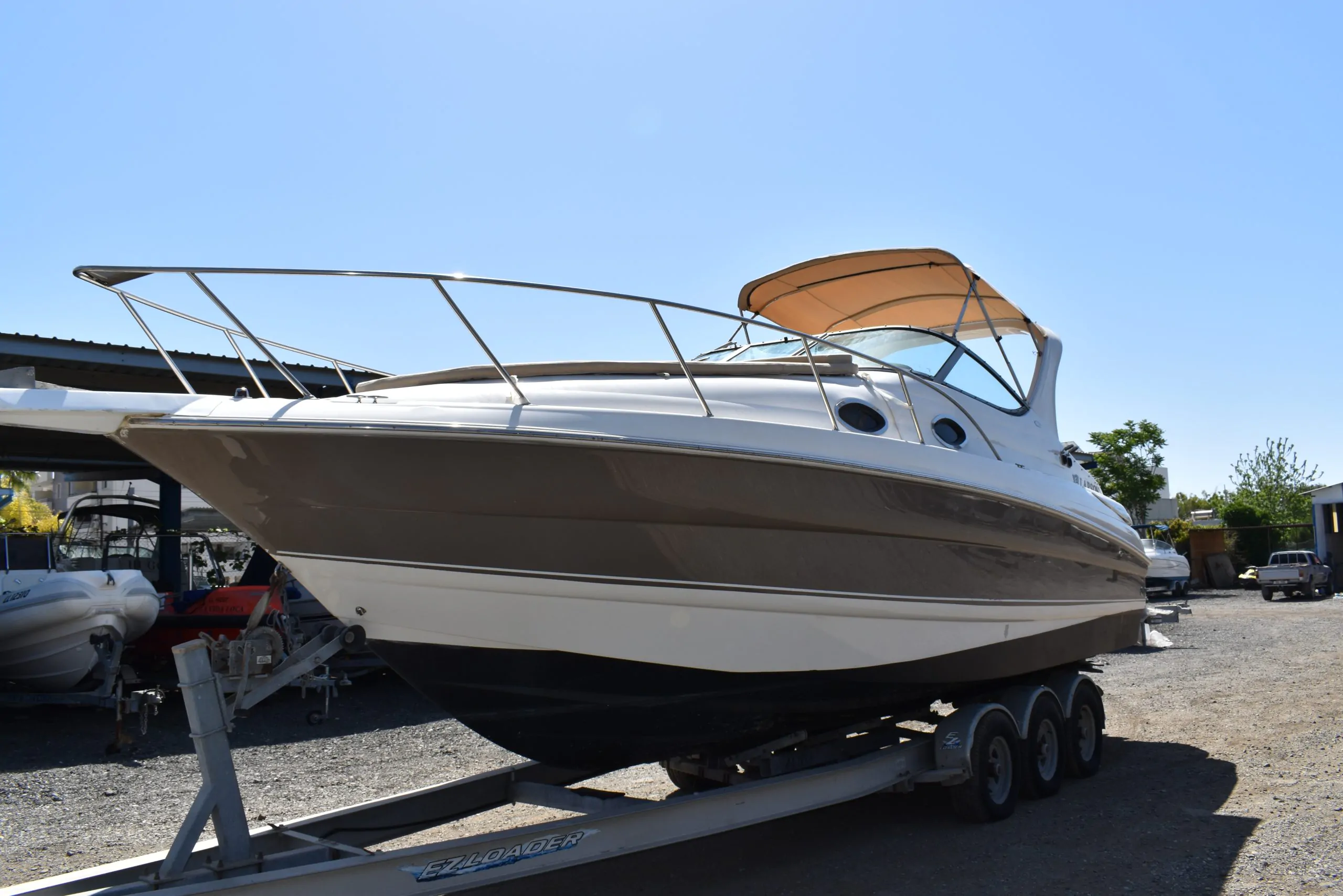 A popular model for Larson, the 290 Cabrio (2005) is well-appointed express whose roomy accommodations and affordable price struck a good balance between comfort and value. She was built on what Larson calls a Duo DeltaConic hull, which incorporates a notched bottom design said to improve both lift and top-end performance. Above deck, the cockpit is arranged with a removable L-shaped lounge and a doublewide, back to-back seat at the helm. Additional features include a tilt wheel, serviceable side decks, a power-assist engine hatch, and a walkthrough transom.