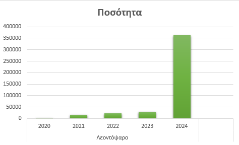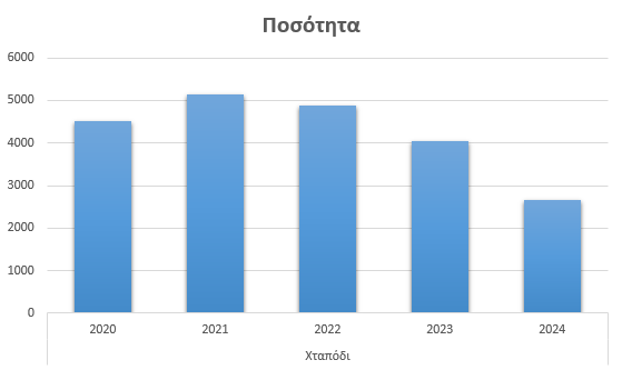 Το καλαμάρι εμφανίζει ιδιαίτερα ασταθή εικόνα. Από 8.706 κιλά το 2020, οι ποσότητες αυξήθηκαν το 2021 στα 10.486 κιλά και το 2022 στα 10.763 κιλά. Το 2023 καταγράφηκε μια εξαιρετικά μεγάλη αύξηση, με την παραγωγή να εκτοξεύεται στα 36.274 κιλά, γεγονός που αποτελεί έντονη απόκλιση σε σχέση με τα υπόλοιπα έτη. Το 2024, όμως, ακολούθησε απότομη πτώση, με τις ποσότητες να επιστρέφουν στα 8.399 κιλά.