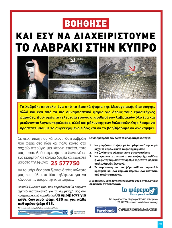 Μια σημαντική προσπάθεια έχει ξεκινήσει εδώ και αρκετό καιρό απο την ομάδα του περιοδικού μας , με σκοπό την συλλογή δεδομένων για να βοηθήσουμε στην ανάκαμψη των θαλασσιών αποθεμάτων. Με την βοήθεια του Τ.Α.Θ.Ε και της Αρχής Λιμένων και με υπεύθυνο συντονιστή τον Ανδρέα Ανδρέου μαρκάρουμε και απελευθερώνουμε ψάρια με σκοπό να μελετήσουμε διάφορες πτυχές της ζωής τους και να τα βοηθήσουμε. Οποιος βρεί ψάρια με την ζετική σήμανση παρακαλώ να επικοινωνήσει μαζί μας.