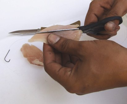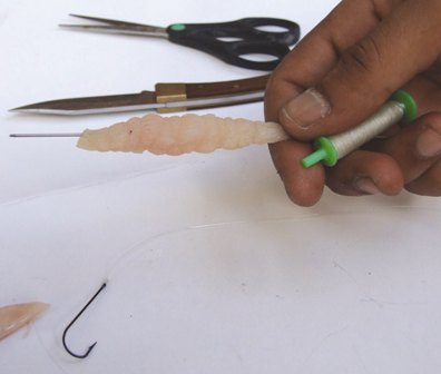 κοψε ενα μακροστενο κομματι περασε το πανω σε βελονα και τυλιξε το με ελαστικο νημα. μετα περνας το στο αγκιστρι οπως τα σκουλικια