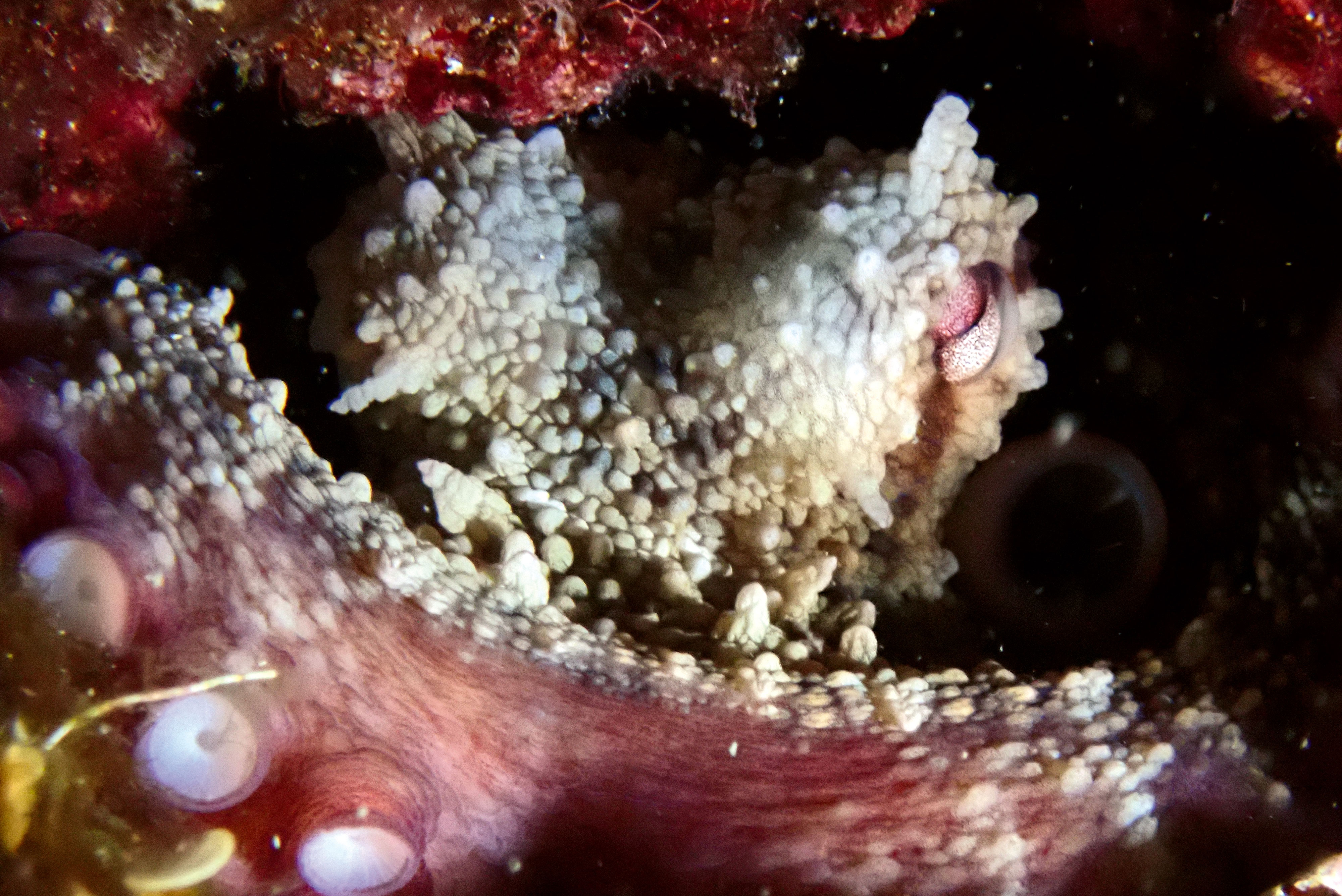 Το χταπόδι συνήθως τρέφεται με καρκινοειδή, δίθυρα και γαστερόποδα. Αφού τραφεί, το κεφαλόποδο «στολίζει» τη φωλιά του με υπολείμματα θηραμάτων, τα οποία συμβάλλουν στη μείωση του ανοίγματος της φωλιάς, εμποδίζοντας έτσι την είσοδο αρπακτικών στη φωλιά.