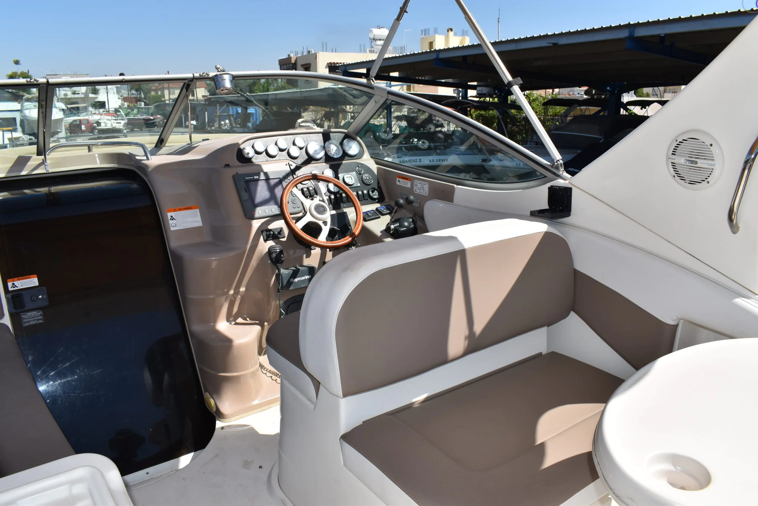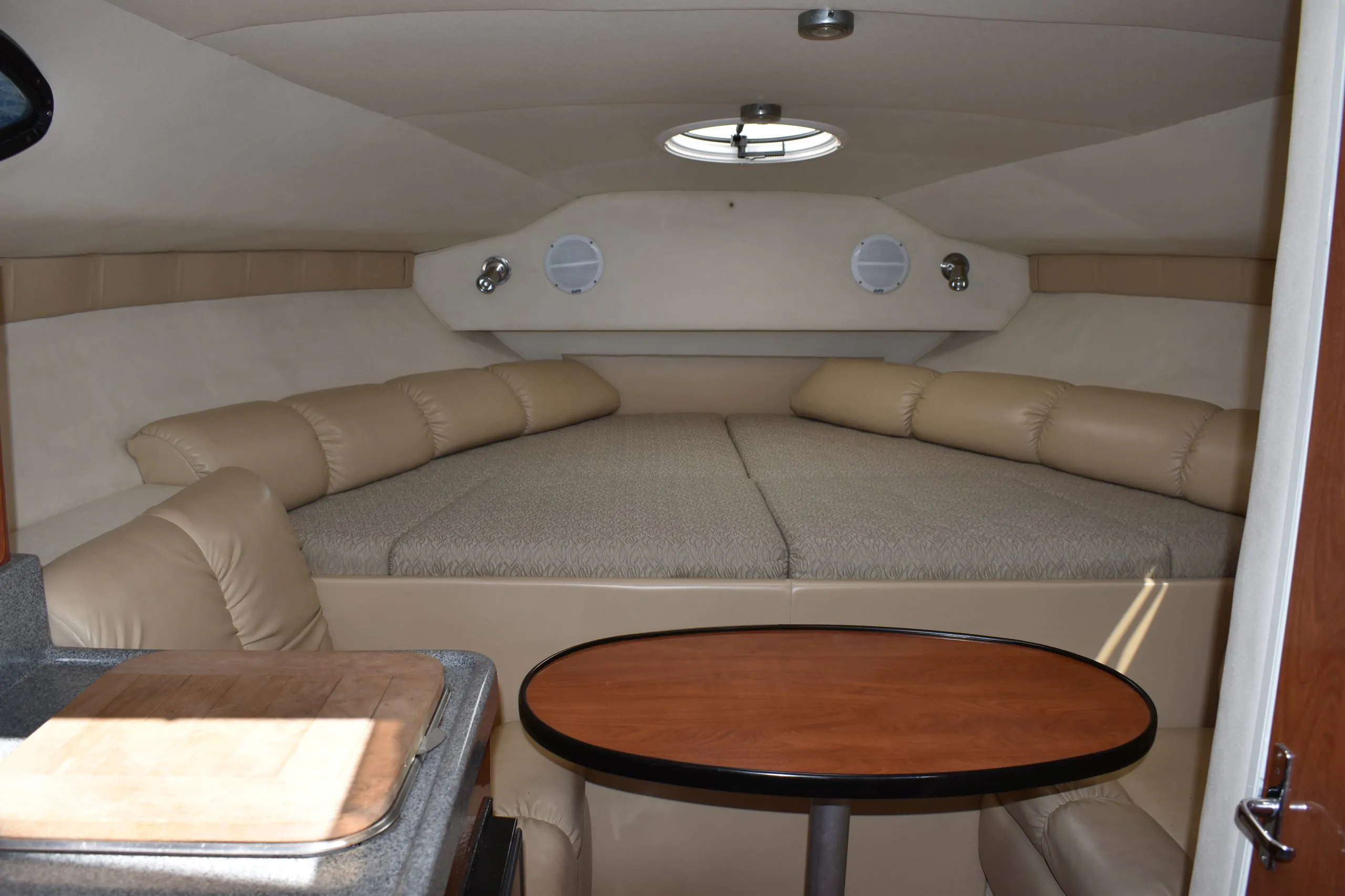 A popular model for Larson, the 290 Cabrio is well-appointed express whose roomy accommodations and affordable price struck a good balance between comfort and value. She was built on what Larson calls a Duo DeltaConic hull, which incorporates a notched bottom design said to improve both lift and top-end performance. Above deck, the cockpit is arranged with a removable L-shaped lounge and a doublewide, back to-back seat at the helm. Additional features include a tilt wheel, serviceable side decks, a power-assist engine hatch, and a walkthrough transom.
