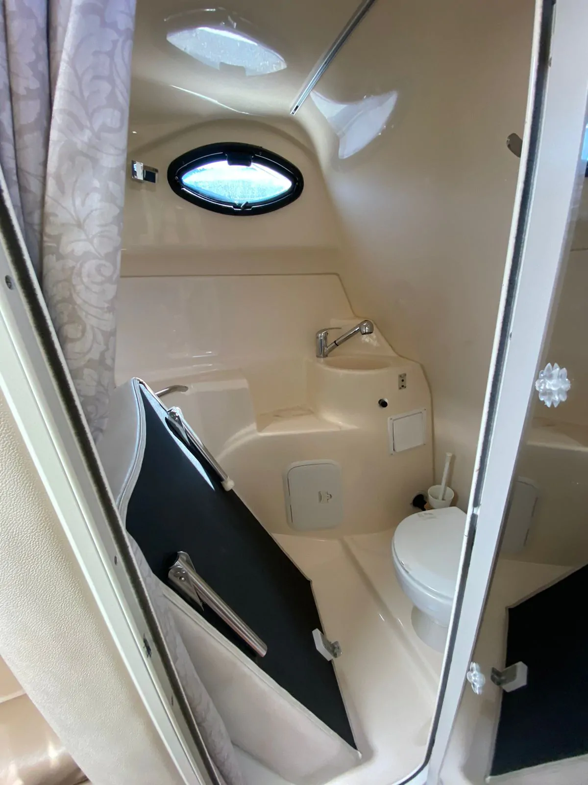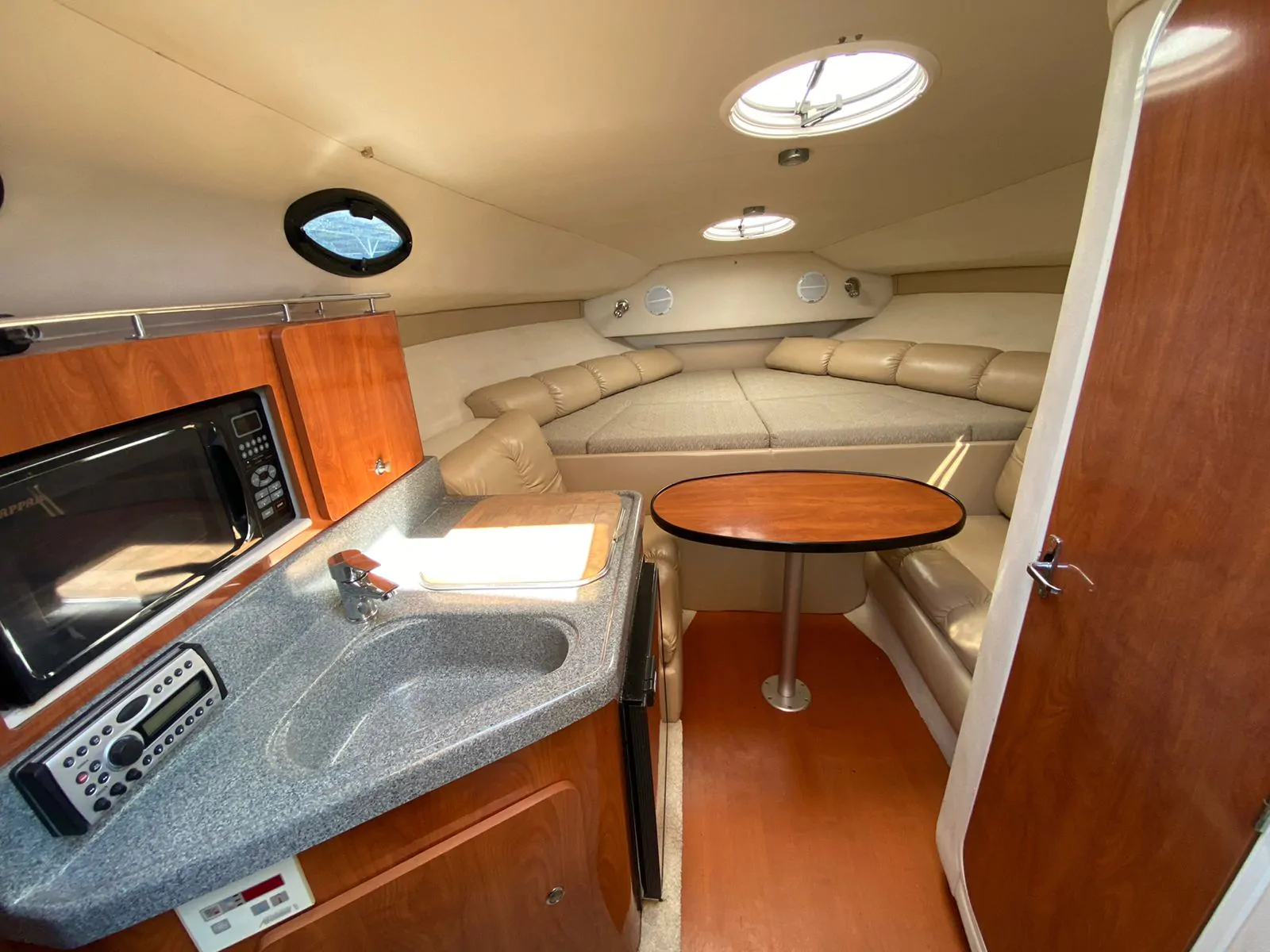 A popular model for Larson, the 290 Cabrio (2005) is well-appointed express whose roomy accommodations and affordable price struck a good balance between comfort and value. She was built on what Larson calls a Duo DeltaConic hull, which incorporates a notched bottom design said to improve both lift and top-end performance. Above deck, the cockpit is arranged with a removable L-shaped lounge and a doublewide, back to-back seat at the helm. Additional features include a tilt wheel, serviceable side decks, a power-assist engine hatch, and a walkthrough transom.