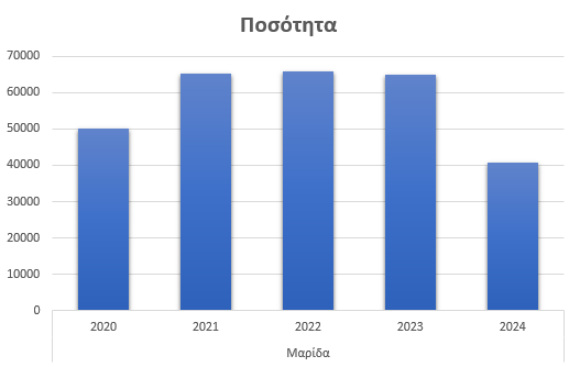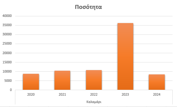 Το καλαμάρι εμφανίζει ιδιαίτερα ασταθή εικόνα. Από 8.706 κιλά το 2020, οι ποσότητες αυξήθηκαν το 2021 στα 10.486 κιλά και το 2022 στα 10.763 κιλά. Το 2023 καταγράφηκε μια εξαιρετικά μεγάλη αύξηση, με την παραγωγή να εκτοξεύεται στα 36.274 κιλά, γεγονός που αποτελεί έντονη απόκλιση σε σχέση με τα υπόλοιπα έτη. Το 2024, όμως, ακολούθησε απότομη πτώση, με τις ποσότητες να επιστρέφουν στα 8.399 κιλά.