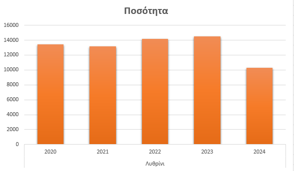 Το λυθρίνι παρουσιάζει μικρές διακυμάνσεις αλλά συνολικά αρνητική εξέλιξη το 2024. Από 13.462 κιλά το 2020, οι ποσότητες μειώθηκαν ελαφρά το 2021 στα 13.154 κιλά, αυξήθηκαν το 2022 στα 14.198 κιλά και συνέχισαν ανοδικά το 2023 στα 14.512 κιλά. Ωστόσο, το 2024 καταγράφηκε έντονη πτώση, με τις ποσότητες να μειώνονται στα 10.282 κιλά.