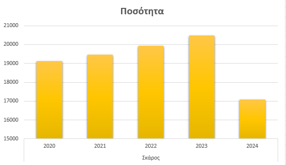 Ο σκάρος παρουσιάζει μια ήπια αυξητική τάση έως το 2023 και στη συνέχεια υποχώρηση. Συγκεκριμένα, από 19.113 κιλά το 2020, οι ποσότητες αυξήθηκαν στα 19.452 κιλά το 2021, στα 19.934 κιλά το 2022 και στα 20.474 κιλά το 2023. Το 2024, όμως, σημειώθηκε μείωση, με την παραγωγή να πέφτει στα 17.079 κιλά, διακόπτοντας τη μέχρι τότε ανοδική πορεία.