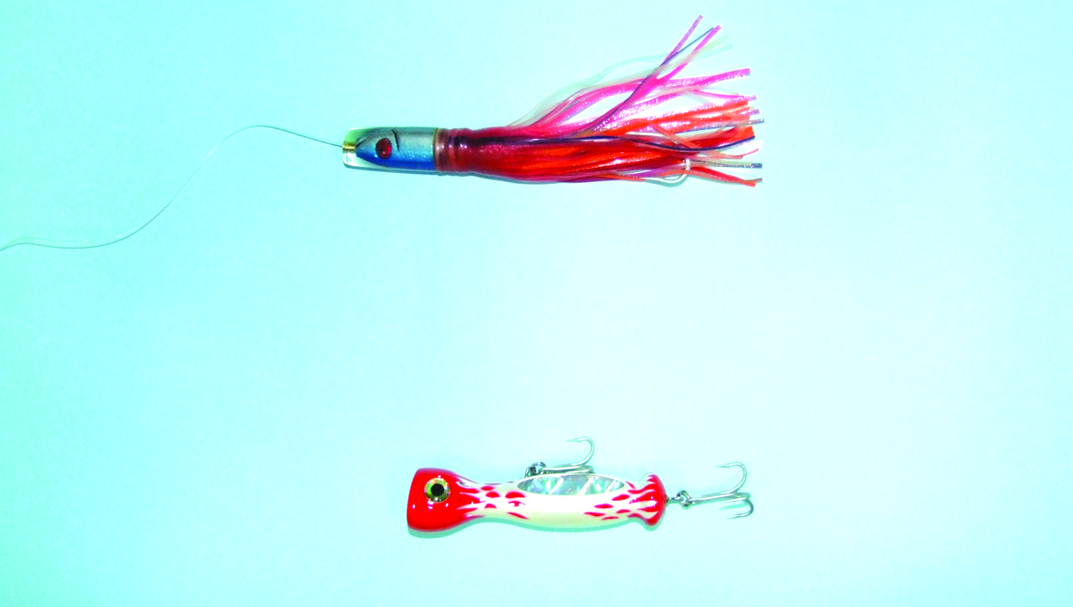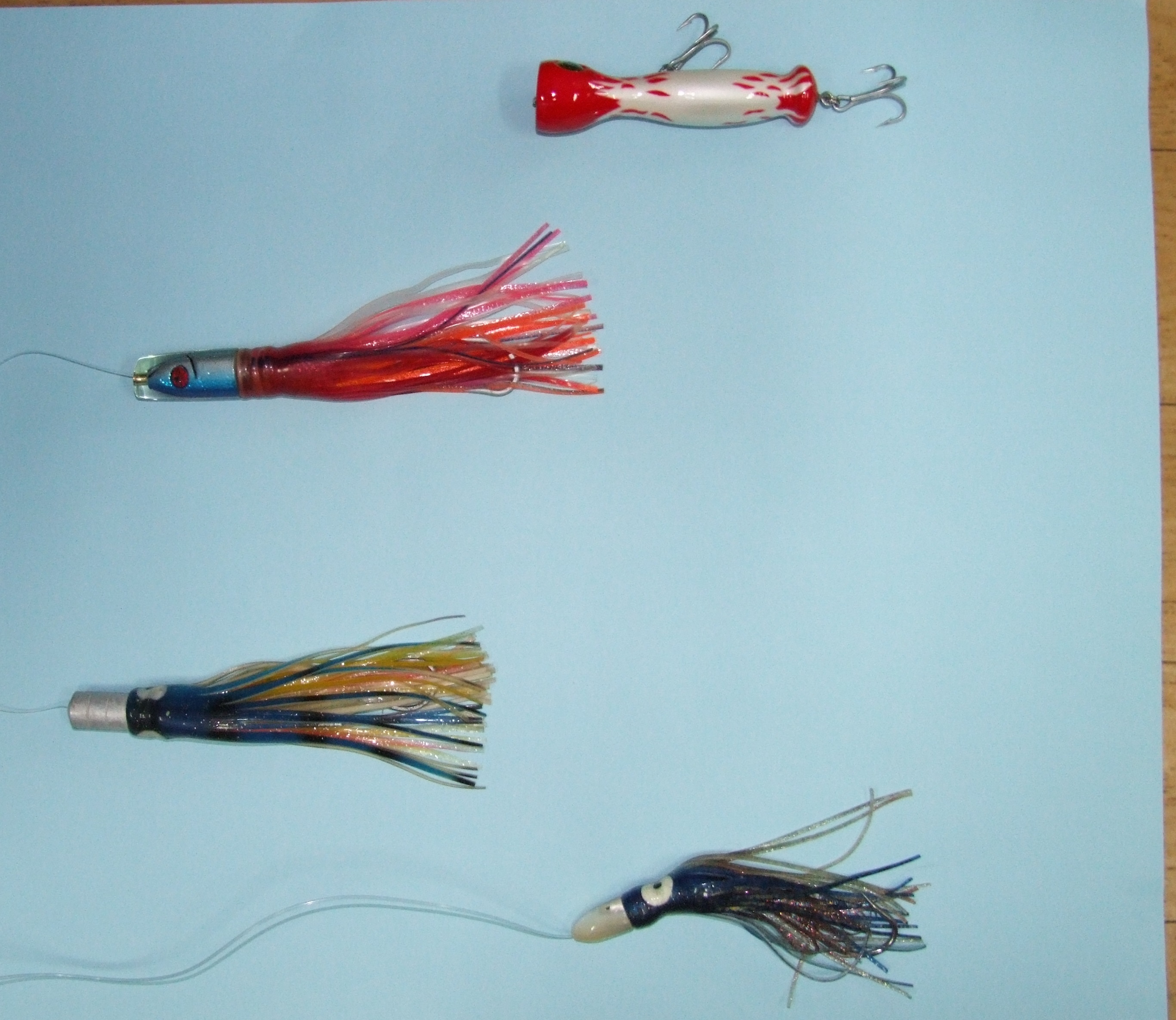 Τώρα για δολώματα επιφανείας μπορούμε να επιλέξουμε ανάμεσα σε poppers, jig (bullet) heads, kona heads, plugs , jet heads και αρκετά άλλα που υπάρχουν στην αγορά. Προσωπικά τις μεγαλύτερες επιτυχίες τις είχα σε ανοιχτόχρωμα poppers μικρού μεγέθους 10-12 εκατοστών . Ένα popper πίσω από τα τεχνητά μου ψαράκια μου χάριζε αρκετές φορές χτυπήματα και τις περισσότερες φορές όταν έβρισκα το κοπάδι περισσότερα από ένα . Μάλιστα το popper είναι πιο αποδοτικό μέρες με ήσυχες θάλασσες όπου ο παφλασμός του τεχνητού στο νερό δραστηριοποιεί περισσότερο τα ψάρια.