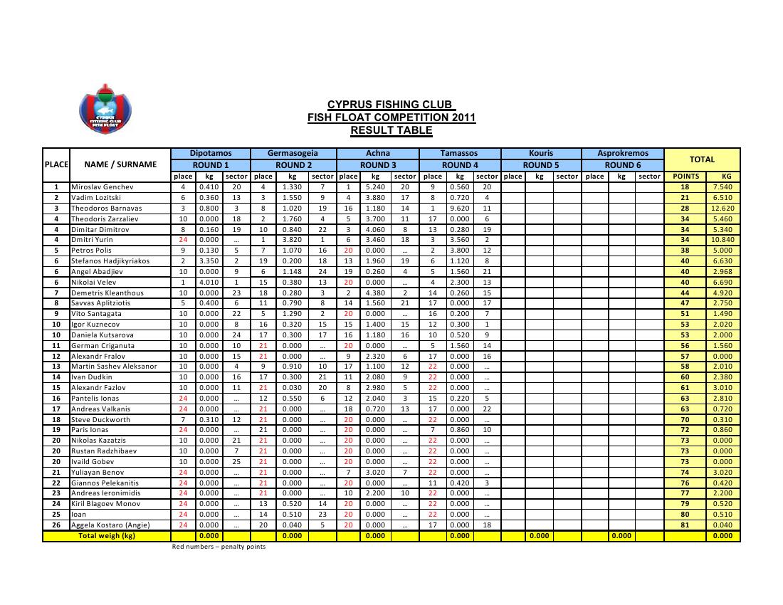 το πρωτάθλημα έχει τελείωση για το 2011 και είμαστε στη ευχάριστη θέση να σας ανακοινώσουμε ότι θα υπάρξει ένα μικρό party για τη απονομή πρώτης, δεύτερης και τρίτης θέσης. Να αναφέρω ακόμη ότι θα μιλήσουμε για μελλοντικά σχέδια που έχει το σωματείο για το 2012 και πιο σημαντικό τη σεμινάρια θα ακολουθήσουν από το Fish Float Club.