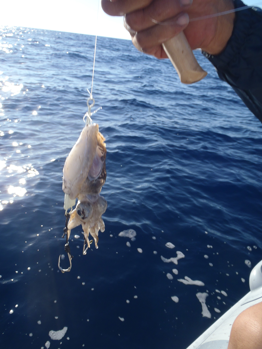 Η τέταρτη και τελευταία σουπιά ήταν δολωμένη και κατέβηκε και αυτή στον βυθό. Μικροτσιμπιές παρενοχλούσαν το δόλωμα. Ανεβάσαμε και είδαμε ότι το δόλωμα είχε δεχθεί επίθεση από μικρά κουνελόψαρα, γεγονός που πρόδωσαν οι χαρακτηριστικές τριγωνικές δαγκωματιές στις άκρες.